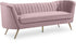 Lean back and lounge in luxurious style on this stunning Margo pink velvet sofa by Meridian Furniture. This contemporary sofa features plush velvet upholstery that is both classy and sumptuous against your skin, a single seat cushion and rounded arms that curve into a low, rounded back, creating a perfect, modern piece for your home. Gold stainless steel legs support this sofa and provide stunning contrast to the sofa's plush, pink fabric. Pink Blush Velvet Gold Stainless Legs Curved Back Design