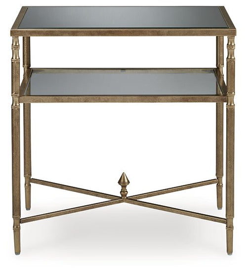 This end table gives traditional design a wonderful sense of relevance. Its details, which include embellished legs and a stretcher with a decorative center finial, are timeless classics. The aged goldtone coloration is the essence of relaxed elegance. An underlying shelf adds style, substance and functionality.