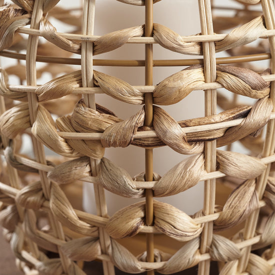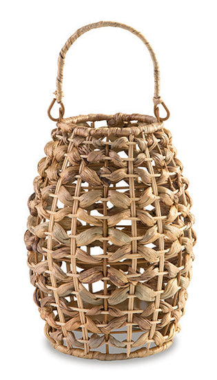 With its woven natural rattan and open-and-airy design, this lantern appeals to those turned on by a natural, bohemian sense of style. Holds one flameless pillar candle (not included).