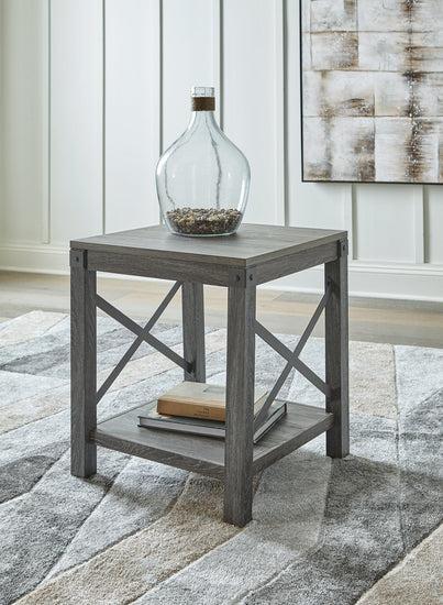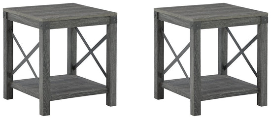 Open the door to modern farmhouse style with this square end table set. The beautiful woodgrain look and classic crossbuck metal accents are a cool touch, while the lower shelf provides surface space for fashionable home accessories.