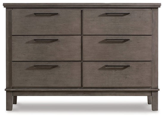 Loaded with structured style and a touch of edgy flair, this dresser suits those with casually cool attitudes. Dressed in an antiqued gray, its thick top and tapered feet keep the simple design fresh. Six smooth-gliding drawers sport metal bar pulls for an instantly classic storage solution.