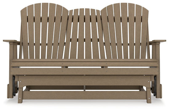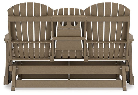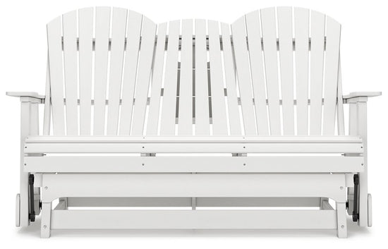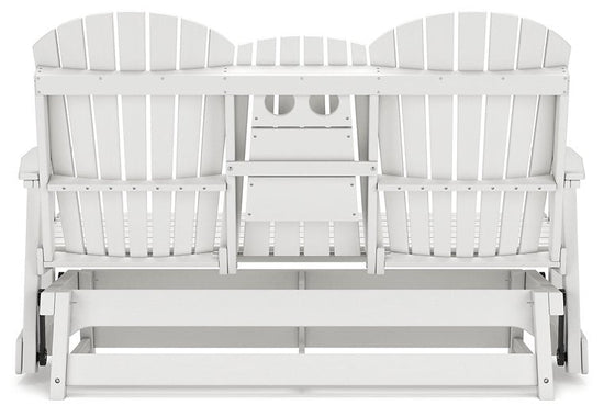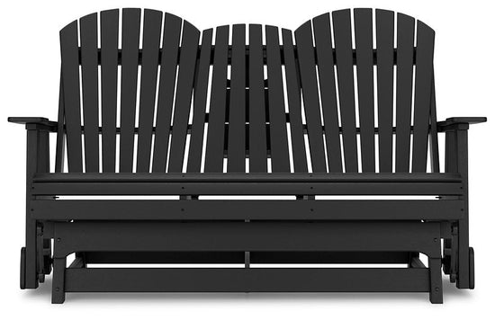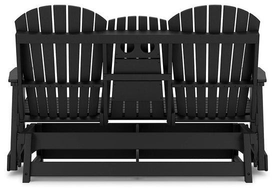 Drift away from everyday worries and into outdoor bliss with this glider loveseat. Dressed in chic black, the Adirondack-inspired design has a classic feel. It weathers sunny summer days and cozy winter nights with durable MEGA TUFF™ HDPE material. A drop-down console with integrated cup holders keeps refreshments and snacks within easy reach. With the console snapped into the back, this loveseat has even more room for enjoying lazy days in the shade.
