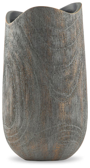 Simplicity at its finest. Antiqued gray and goldtone combine with a unique curved mouth to create this vase’s artisan approach to style. Allow the piece to make a solo statement, or use it to display beautiful seasonal blooms.
