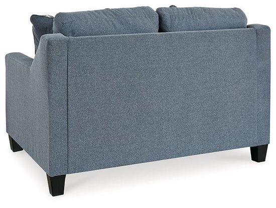 Sporting a 2-over-2 box cushion design for a clean and uncluttered aesthetic, this loveseat is a lovely choice in contemporary furniture. Elements include slim track arms with angled flair, sleek tapered feet and a feel-good flatwoven twilight blue upholstery that’s a refreshing change from the everyday ordinary. Assorted throw pillows in mellow, muted tones incorporate an updated farmhouse look.