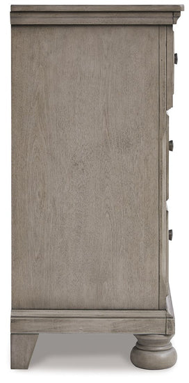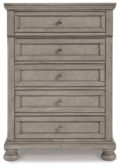 Satisfying your taste for tradition, this chest of drawers sports serene sophistication. Forever classic design details—inlaid panels, silvertone patina hardware and bun feet—are so easy to love. Its burnished light gray finish elevates the look with modern sensibility. Five roomy drawers keep your wardrobe organized in style.