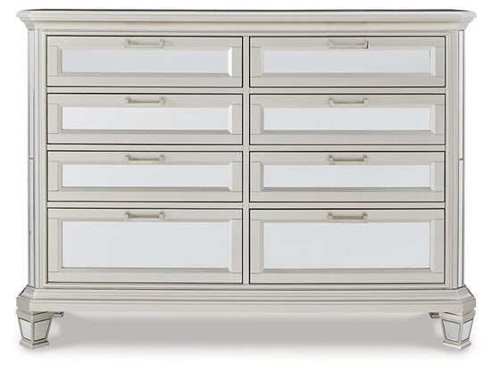 Seamlessly complete your bedroom with this striking dresser. Its metallic silvertone finish is bold on its own, while inset beveled mirror accents take this dynamic piece to the next level. Eight smooth-gliding drawers allow for the perfect balance of function and forward-thinking design, and jewelry trays inside each top drawer of the dresser add a finishing touch.