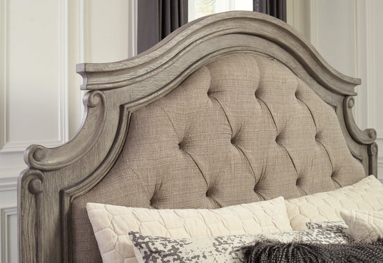 Cottage quaint styling and quality construction make this California king panel bed a dream come true. An antiqued gray finish and beige upholstery provide rustic warmth. The ornately shaped headboard marries classic design with homey charm for an elegant bedroom must-have.