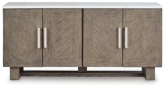Welcome casual, contemporary style and functionality to your home. This TV stand delivers a mixed-material vibe with its white marble top and grayish brown finish, lending a laid-back look that’s so welcome at the end of a long day. Cabinet doors with framed chevron accents and large silvertone pulls add dimension and style. And there’s plenty of room to store entertainment accessories, with adjustable shelving and cord management holes for added convenience and versatility.