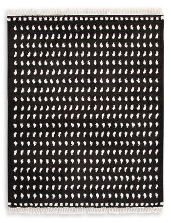 Sink your feet into this modern area rug. Offering a luxurious shag with a woven dot design in black and white, it adds sophistication without sacrificing comfort or durability. A braided tassel edge completes the design of this family-friendly accent rug.